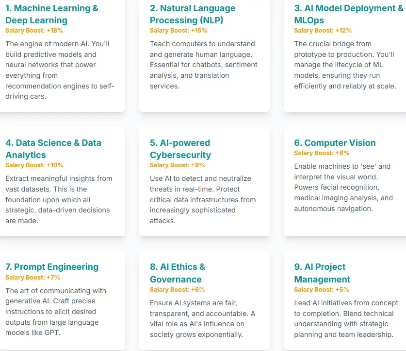 If you’ve ever felt stuck in a career plateau, this is your chance to break free. Below are the 10 AI skills 2025 professionals need — along with potential salary boosts and free resources to start learning today.