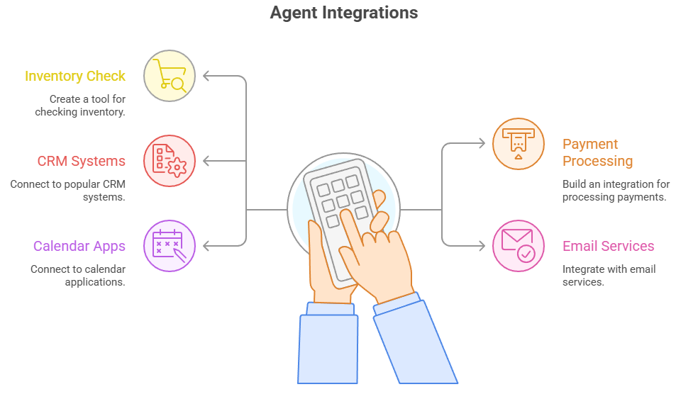 Want your agent to check inventory? Create a tool for that. Need it to process payments? Build that integration. Popular connections include CRM systems, email services, and calendar apps.